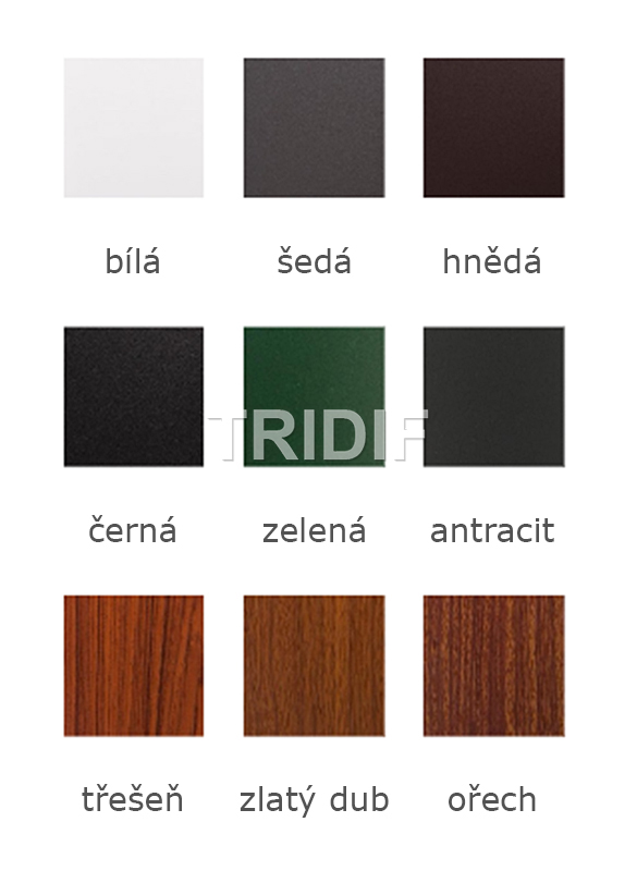 - Povrchové úpravy: Práškové lakování v šesti barevných provedeních. V nabídce máme tři dřevěné dekory.